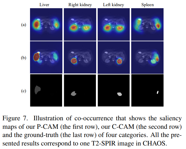 2) co-occurrence(동시 발생 현상). 위의 예시처럼 복부 자기 영역에서 서로 다른 장기가 동시에 나온다.(자연에서의 이미지와의 차이점) 이로 인해 CAM은 image-level labels에서 co-occurrence 현상을 구분해내기 어렵다.