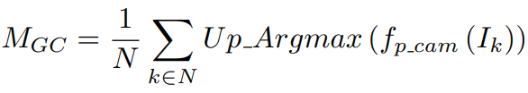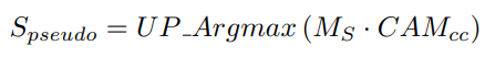 - 최종 saliency map인 CAMac를 얻기 위해 CAMcc와 곱한 후, argmax 및 upscaling을 통해 pseudo mask를 얻는다. 이 마스크가 최종적으로 full-supervision 단계의 U-Net 모델 학습에 사용된다.