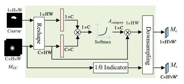 - Coarse mask와 MGC는 각각 convolution layer를 거쳐 같은 차원으로 변환된다. 이후 두 행렬을 곱한 값에 softmax를 이용해 category별 확률을 매핑한다.