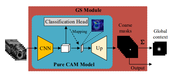 - CAM이 생성한 salency map(heat map 정도로 해석?)은 segmentation task에 충분히 정확하진 않지만 medical image에 대한 category와 anatomy과 관련된 가치 있는 정보를 제공할 수 있다. 그래서 이런 정보를 활용하기 위해 GS(Global Sampling) module을 설계했다.