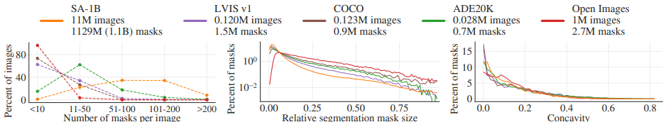 SA-1B는 기존의 가장 큰 분할 데이터셋인 Open Images보다 11배 많은 이미지와 400배 많은 마스크를 가지고 있습니다.