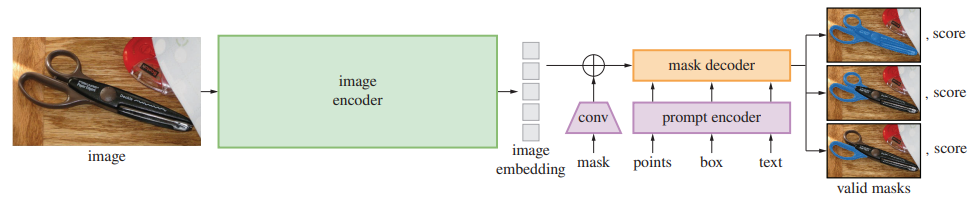 - mask decoder : 이미지 임베딩, 프롬프트 임베딩 및 출력 토큰을 마스크에 효율적으로 매핑합니다.
